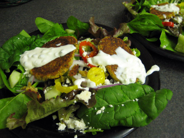 This falafel does not use egg. Some cooks claim that traditional falafel contains neither egg nor tahini, although several recipes I looked at called for sesame seeds. Everyone knows that chick peas and sesame seeds are meant for each other, so why not save a step and just toss in the pureed sesame seeds in the form of tahini? Besides, I had some serious concerns about whether or not these patties would hold together in cooking. The tahini added just a little bid of a binding agent. Everything held together beautifully, though. Dinner was a very satisfactory success.